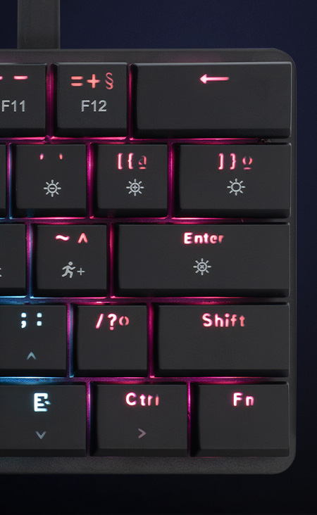 O teclado TGT Sherman LP60 conta com iluminação Rainbow com 17 tipos de efeitos, permitindo que você crie um setup único e imersivo! Seu design ultracompacto de 60% se adapta a qualquer estilo de gameplay, liberando espaço na sua mesa e, junto com seu design low profile, proporciona mais liberdade para movimentos rápidos e precisos.